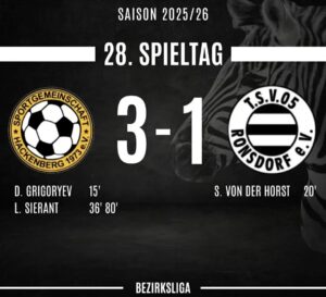 Wir nehmen wieder mal keine Punkte mit nach Hause… Hackenberg war von Beginn an spritziger und giftiger, sodass die Niederlage am Ende verdient ist. Nach dem starken Auftritt in der Vorwoche, als wir gegen den Tabellenzweiten SV Solingen 08/10 noch ein Unentschieden holen konnten, war unsere Mannschaft heute leider kaum wiederzuerkennen und insgesamt nicht in guter Verfassung. In der 63. Minute kam es zu einem Zusammenprall zwischen unserem Spieler Nico Langels und dem Torwart Sebastian Andreas Weber von Berghausen, bei dem sich der gegnerische Keeper schwer verletzte. Gute Besserung an dieser Stelle – komm schnell wieder auf die Beine! ![]()